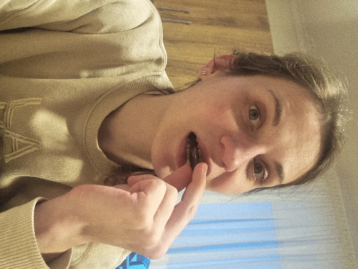 An adult female is depicted indoors, looking directly at the camera with wide-open eyes and an open mouth. She has light-colored hair pulled back and wears a light beige crew-neck sweater, embroidered with partial lettering, appearing to be "LA", on the chest. A small, gold-colored stud earring is visible in her left earlobe. Her right hand is positioned with the index finger inserting a dark, circular object into her mouth. The background on the left shows light-toned wooden cabinetry or furniture. On the right, a window covered by a sheer, light-colored curtain reveals a faint blue hue, possibly from the sky. The scene suggests a private residential interior in Riga, Latvia.