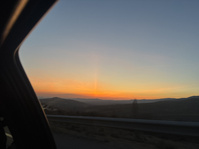 The image presents a sunset over a mountainous landscape near Casas del Puerto, Spain, viewed from the interior of a vehicle