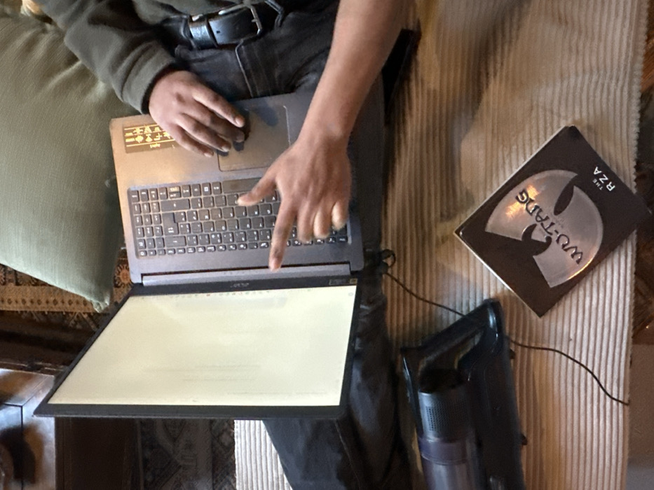 An overhead view reveals an indoor setting in Palaiseau, France. A person, partially visible in dark long-sleeved attire and dark pants with a black belt, is seated, holding an open dark-colored laptop on their lap. The laptop screen is illuminated and predominantly blank with faint vertical lines of text. The person's left hand rests on the laptop's touchpad, while the right index finger points towards the left side of the screen. To the lower left of the laptop, a dark handheld vacuum cleaner with a grey cylindrical component rests on a light-colored, horizontally ribbed surface, connected by a black cable. To the right of the vacuum, a book titled "WU-TANG THE RZA" featuring a metallic Wu-Tang Clan logo is positioned diagonally on the same ribbed surface. A light green cushion is visible in the upper background, backed by a patterned rug or tapestry and a dark wooden furniture edge.