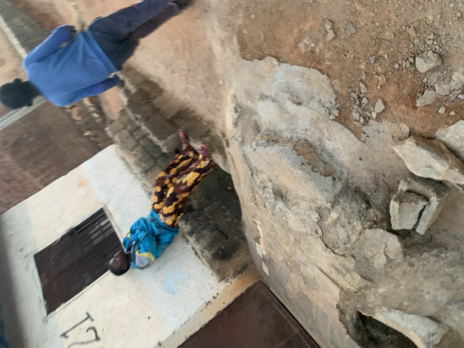 This image depicts an outdoor residential scene in Jos, Nigeria. Two individuals are present amidst weathered architectural elements and an uneven ground surface. In the mid-ground, a person, possibly a child or young adult, leans against a pale-colored building wall. This individual wears a blue and yellow long-sleeved top, patterned trousers primarily in brown, yellow, and black, and pink open-toed footwear. Their arms are crossed, and their head is turned away from the camera's direct line of sight. The wall displays the number "21" painted in black and features a dark brown window with vertical security bars. A dark brown door is partially visible to the left of the leaning individual. To the right and further into the background, a second individual, also appearing to be a child or young adult, walks away from the camera. This person is dressed in a solid blue long-sleeved top and dark trousers, with their back entirely facing the viewer. The ground surface in the foreground and mid-ground is uneven, composed of a mixture of compacted dirt, scattered small rocks, and broken, weathered concrete. A trench-like depression and larger pieces of concrete rubble are visible in the immediate foreground. The environment suggests a common, unpaved residential pathway or yard.