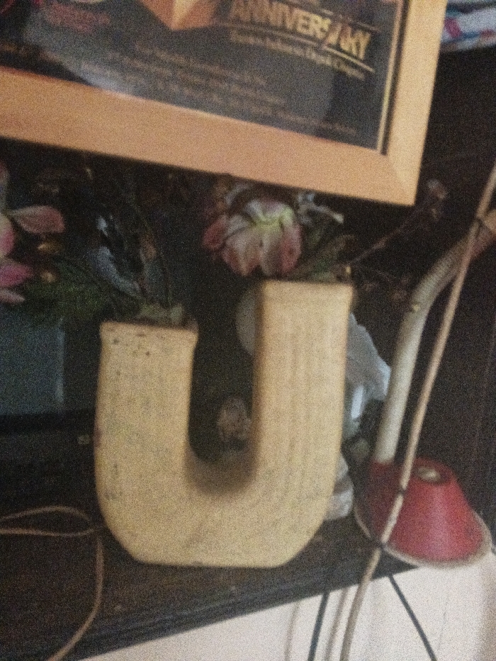 The image presents an indoor still life, centered on a large, light beige, three-dimensional object shaped like the letter "U", which occupies the lower half of the frame. This "U" object possesses a rough, textured surface. Behind and above the "U" is a partially visible framed item with a light wooden border, displaying text that includes "ANNIVERSARY". Artificial flowers with visible pink and lighter-colored blooms amidst green foliage are situated behind the "U" object, against a dark background. To the right of the "U", a portion of a lamp or light fixture is visible, characterized by a red, conical base and a light-colored, slender stem. Several thin wires or cords traverse the lower foreground, some appearing to be associated with the lamp. All objects are positioned on a dark, flat surface, likely a shelf or table. The scene is located in the city of Dogsenang Gorphoog, Bhutan.