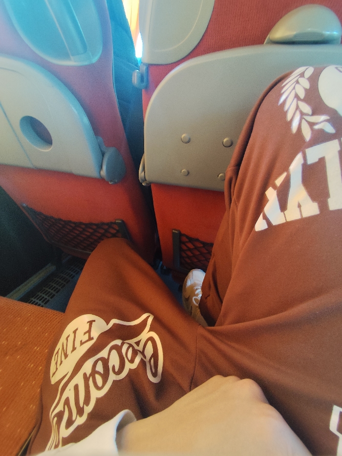 From a low-angle perspective, the scene captures a person seated on a train. The individual wears brown sweatpants adorned with white lettering and designs, including "Second Fine." The train seat is red and gray with a net pocket visible in the background. A small section of a white shoe peeks out from under the sweatpants. The hand of the individual is slightly visible at the bottom of the image.