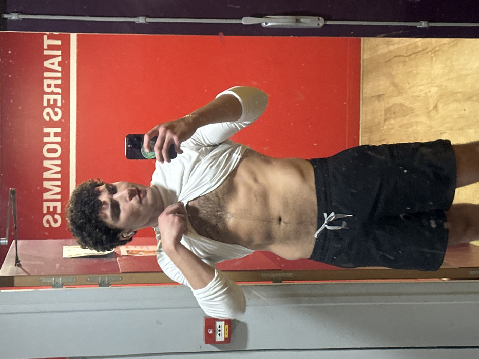 A male individual is depicted taking a mirror selfie in a men's changing room located in Paris, France. The subject, possessing dark, curly hair, wears a white long-sleeved shirt and black shorts with a white drawstring. He lifts his shirt with his right hand, exposing his chest and abdomen, which display body hair. A white earbud is visible in his right ear. He holds a black smartphone, featuring a circular green grip on its back, in his left hand, directed towards the mirror to capture his reflection. The mirrored background reveals a predominantly red wall bearing the reversed French text "2EMMOH 2ERIAIT" (VESTIAIRES HOMMES). To the left, a gray wall section features a mounted red square object with two black circular elements, indicative of an emergency alarm. The reflected floor is light brown, likely wood or laminate. Minor smudges are present on the mirror's surface.