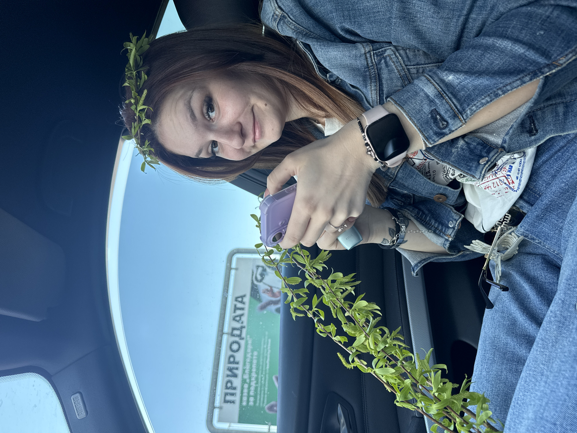 young woman in the passenger seat of a car, likely in Sofia, Bulgaria. She is wearing a denim jacket and jeans, a floral crown, and a smartwatch. She is holding a smartphone in one hand and branches with green leaves in the other. A billboard with the inscription "ПРИРОДАТА" (Nature) and a Bulgarian phrase is visible through the car window. A package labeled "IQOS" is also visible in the woman's hand. Additionally, a pair of glasses are clipped to the seat belt.