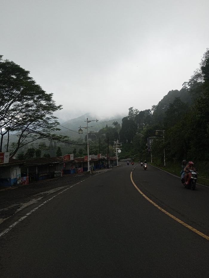 A winding road curves through a landscape with lush, forested hills shrouded in mist. Several motorbikes travel along the road, with a group of people riding one in the foreground. Small, weathered stalls line the roadside to the left. Tall trees frame the scene on either side, adding to the natural setting. The sky is overcast, contributing to a muted color palette.