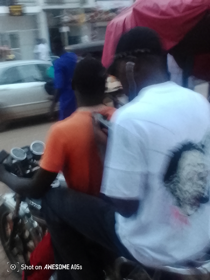 This image depicts a blurred street scene in Awka, Nigeria, focusing on two individuals on a motorcycle