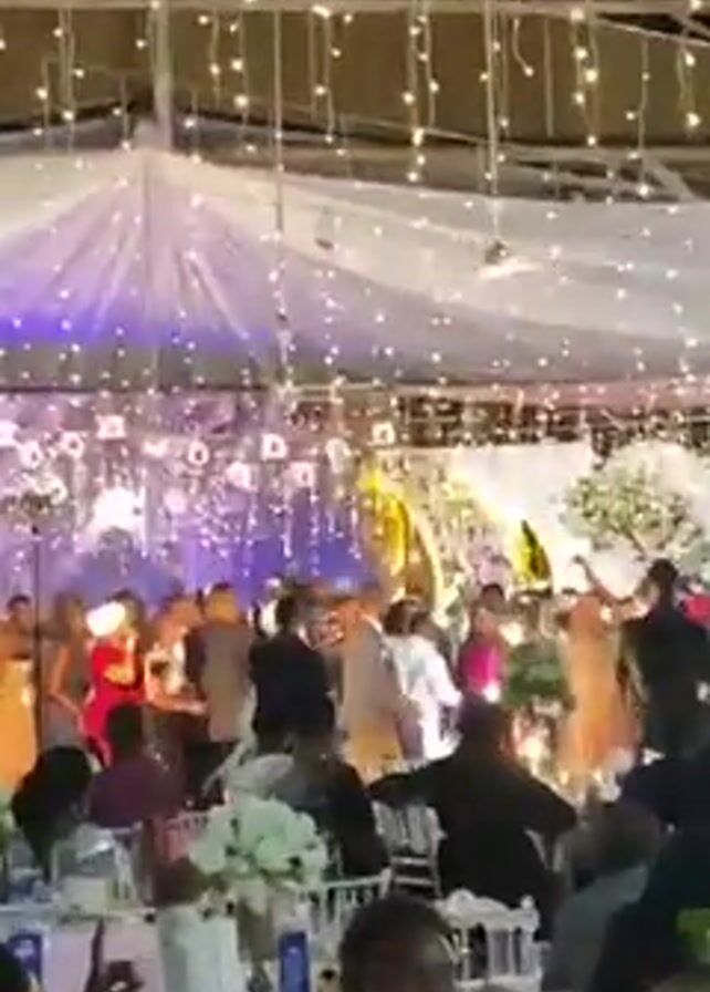 - "wedding reception with guests dancing on a dance floor under a draped ceiling decorated with fairy lights" by FM-hlmC83, licensed under CC BY 4.0
