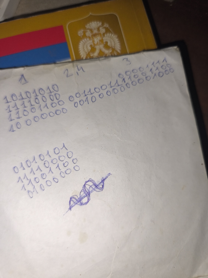 An overhead photograph displays a piece of creased, off-white paper with handwritten blue ink notations resting on a dark surface. Positioned behind the paper is a yellow object featuring a vertical red and blue stripe on its left side, adjacent to a prominent gold-colored double-headed eagle emblem, identifiable as a national symbol of Russia. The paper contains the following specific notations in blue ink: - At the top, the labels "1", "2,4", and "3". - Under label "1": binary strings "10101010", "11110100", "11001100", and "10000000". - Under label "2,4": binary strings "00110011" and "00100000". - Under label "3": binary strings "00001111", "00000100", and "00000000". - In the lower-left section of the paper: binary strings "01010101", "11110100", "11100100", and "01000000". - Below these binary strings, a stylized, curvilinear drawing resembling a complex wave or knot is present. No individuals are visible in the scene. The presence of the Russian national emblem on the background object indicates a context within Russia. While the image does not visually depict specific landmarks of Petrozavodsk, the setting is consistent with an indoor environment where documents or notes are present within the national territory of Russia.