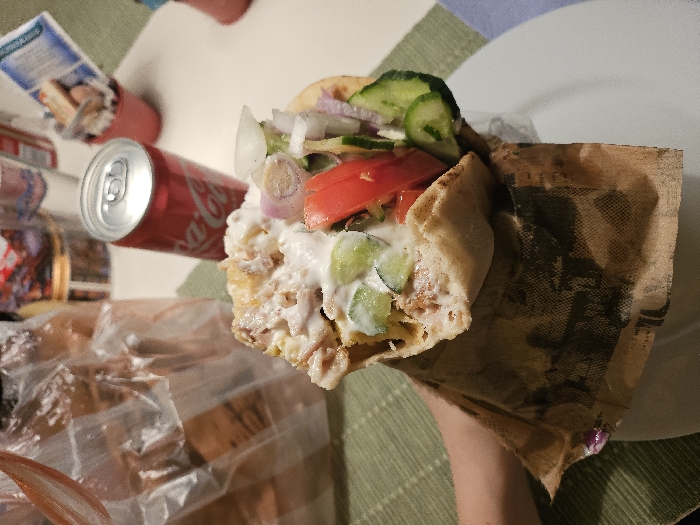 - "An indoor scene depicts a large, open-faced pita bread sandwich, likely gyros or doner, held by a human hand on the left" by FM-LXbvg2, licensed under CC BY 4.0