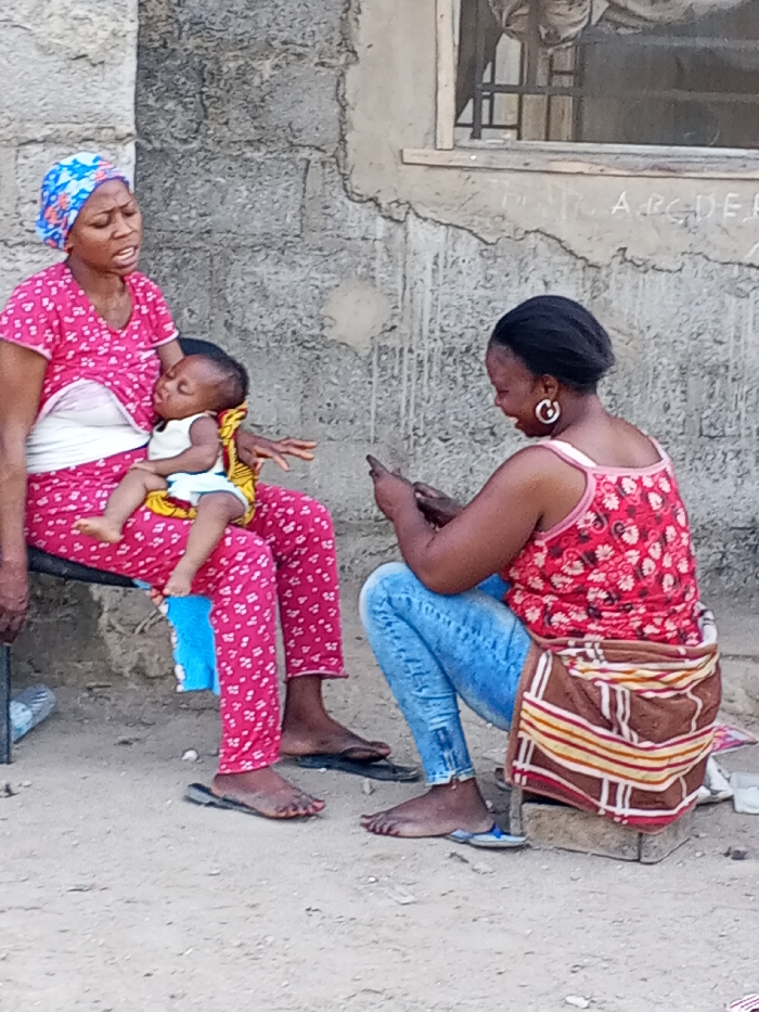 In Adonkolo, Nigeria, an outdoor scene depicts two women and a child positioned on a dirt ground against a distressed concrete block wall