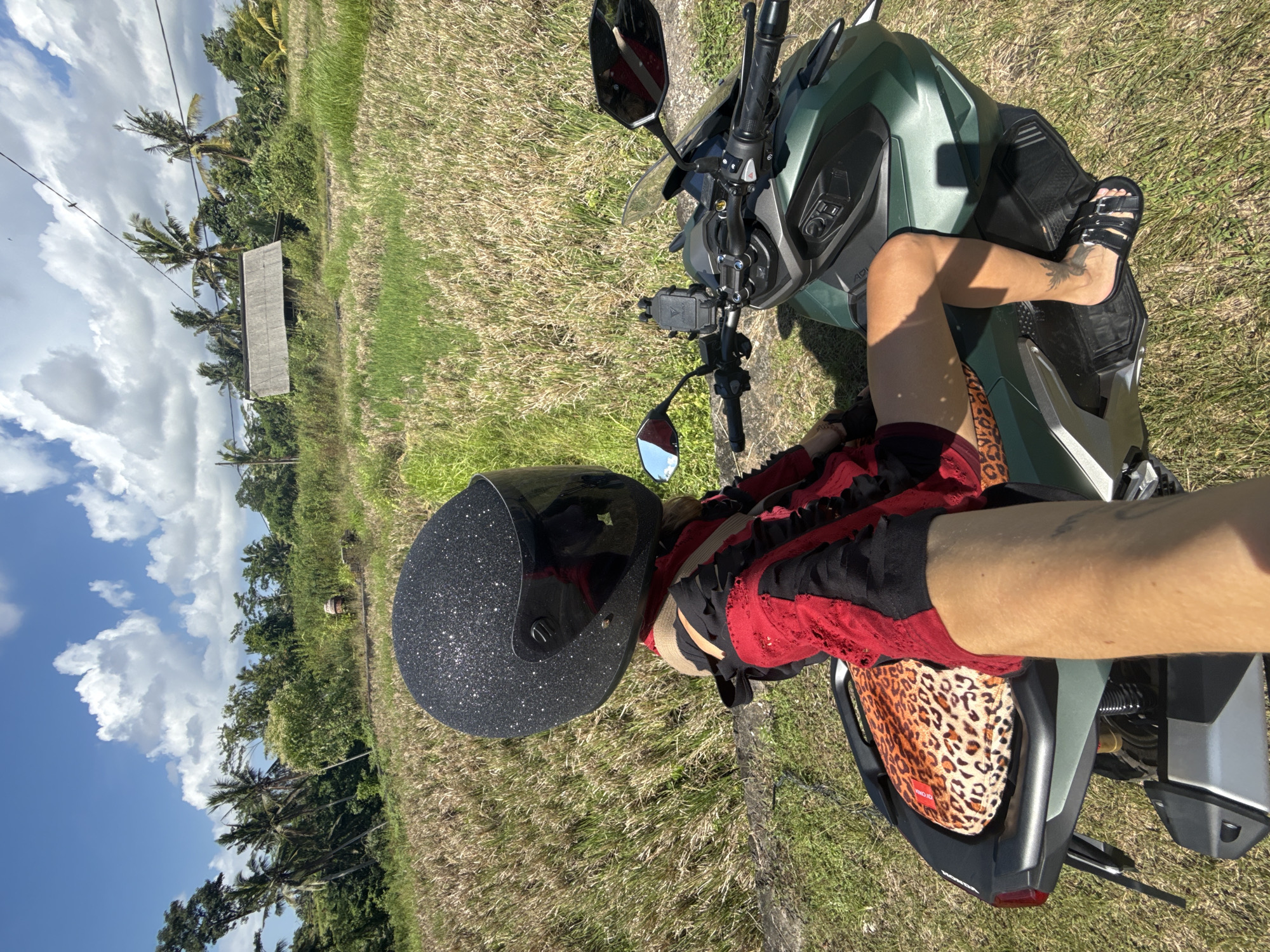 A woman wearing a black and glitter helmet and a red and black lace outfit is straddling a green motorbike on a grassy field. The woman's left leg is visible, showing a tattoo on her ankle, and she is wearing black sandals. Behind her is a brown animal print bag. The motorbike is parked on green grass with a view of a blue sky with white clouds, trees, and a small wooden structure. The location is identified as being in Mas, Indonesia, based on the visual characteristics.