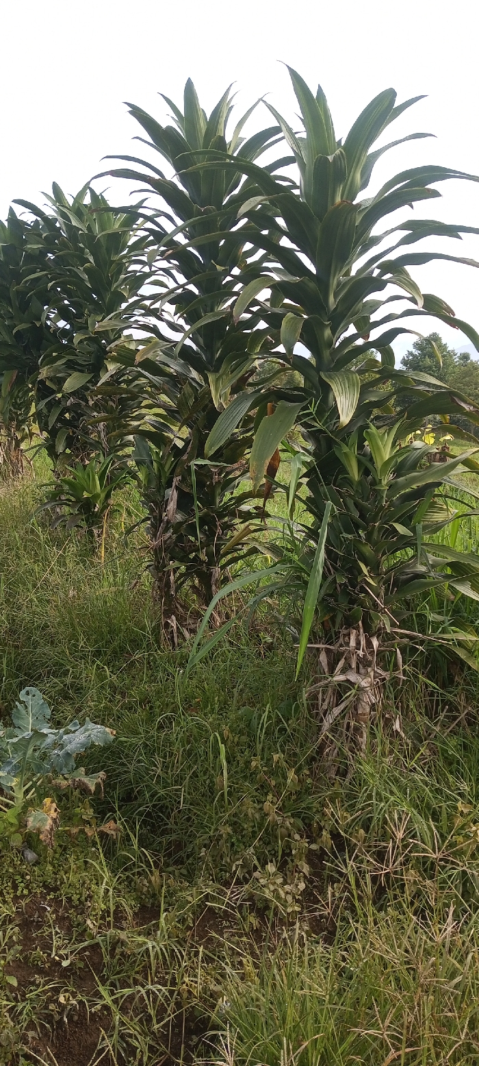 A row of green tropical plants with tall, thick stalks and spiky leaves stretches across a field of tall grass. The plants appear well-established, with several growing close together. A single head of cabbage or similar leafy green vegetable is visible on the left side of the frame, amidst the grassy ground cover. In the background, more greenery and a hint of yellow flowers suggest a broader agricultural setting.