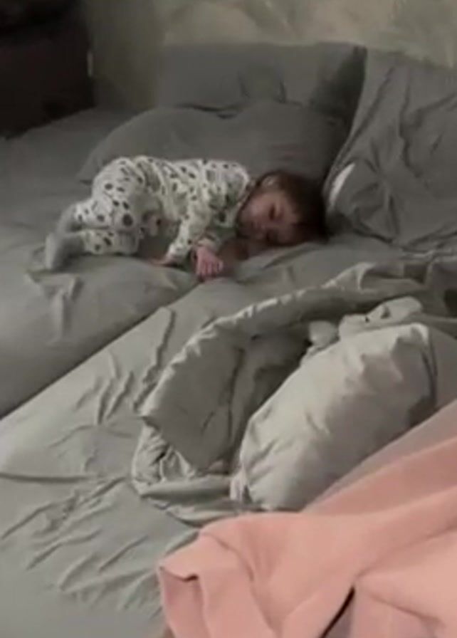 A toddler lies prone on a large bed with gray sheets and pillows, wearing patterned pajamas. A small, brown, plush toy rests beside the child's face. A gray comforter is partially covering the child. To the side of the bed is a stack of cushions, and a pink piece of clothing is draped over the edge of the bed. The wallpaper has a leaf pattern.