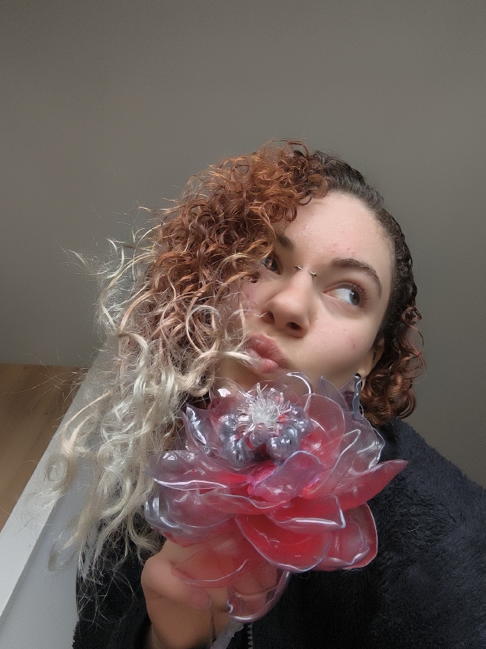 An individual is depicted in a mid-shot portrait, featuring a head and upper torso. The subject has medium-length curly hair, predominantly auburn with lighter blonde highlights, cascading over the left shoulder. The individual’s gaze is directed upwards and to the right, with a subtle pouting expression on the lips. A silver barbell piercing is visible above the right eyebrow. The subject wears a dark, fuzzy-textured garment. Held in the individual's right hand, which is partially obscured, is a large, artificial flower made of layered translucent red and clear plastic petals, featuring a clear, spiky central cluster. The background is a plain light gray wall or ceiling, with a white vertical architectural element and a light brown surface visible on the lower left. The lighting is soft and even, suggesting an indoor location in Unknown, Unknown.