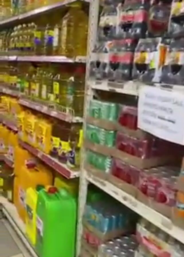 inside of a grocery store. The camera moves along an aisle stocked with cooking oil of various brands and sizes, some in clear plastic bottles, others in yellow or green plastic jugs. Adjacent shelves contain drinks in cans and bottles. There are also shelves stocked with spices and other items. The overall impression is of a well-stocked, tidy grocery store aisle.