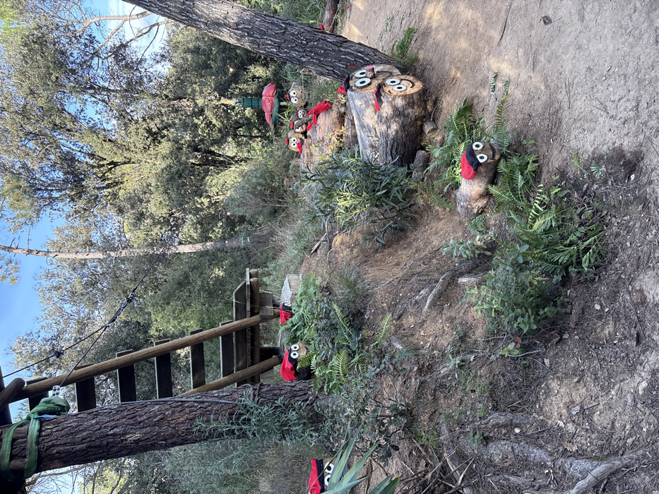 The location is a wooded trail in Castellar del Vallès, Spain. The scene depicts a natural outdoor environment featuring a dirt path and a sloping, vegetated hillside under clear blue skies. On the left, a large tree trunk supports a multi-tiered wooden platform structure with an attached set of wooden stairs ascending diagonally. Green straps secure components to the tree. Directly below and around the platform, several logs or natural wood pieces, stylized as "Tió de Nadal" figures, are visible. These figures feature painted white eyes with black pupils, an oval black nose, and a painted smile, each wearing a red barretina hat with a black stripe and pompom, and partially covered by a red cloth. Some figures are partially obscured by ferns and small bushes on the hillside. Further to the right, a large horizontal log rests on the ground, leaning against another tree, featuring two stacked painted faces in the "Tió de Nadal" style, similarly adorned with barretinas and red coverings. More such figures are arranged further back on the right, some clustered near a red, umbrella-like structure. The background consists of dense forest foliage with tall trees. The ground is a mix of compact dirt, exposed roots, and sparse undergrowth.