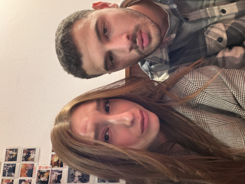 This close-up portrait features two individuals, a female and a male, positioned in an indoor setting