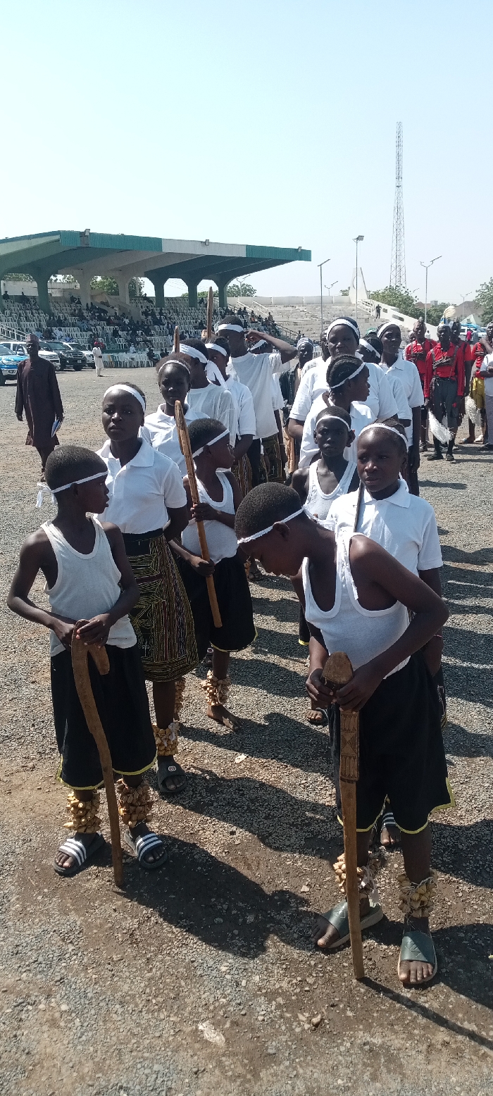 The image depicts an outdoor scene at the Adamawa State Stadium (Ribadu Square) in Jimeta, Yola, Adamawa State, Nigeria, under a clear, bright sky