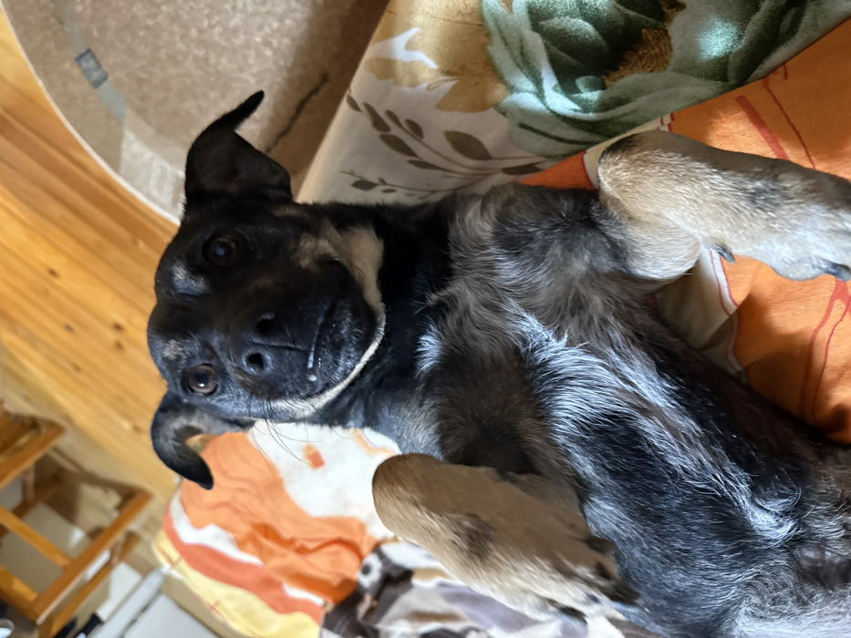 - "A mixed-breed dog, predominantly black and dark brown with tan and greyish markings, is depicted lying on its back on patterned bedding" by FM-Oel3j2, licensed under CC BY 4.0