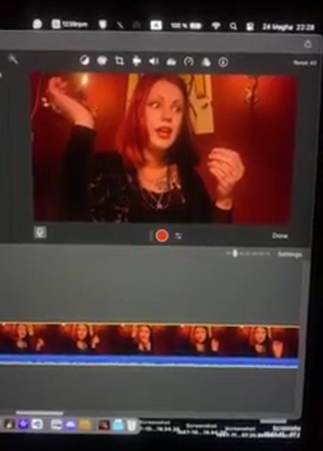 A woman with red hair is displayed on a MacBook Pro screen. She is wearing a black top and several necklaces, and is using her hands to express herself. The video is in a recording and editing stage, as it is shown in the iMovie application. The background is a dim red color, possibly from lighting. There is a thumbnail strip of the video, at the bottom of the screen. The computer's system bar shows the date, time, and battery level.