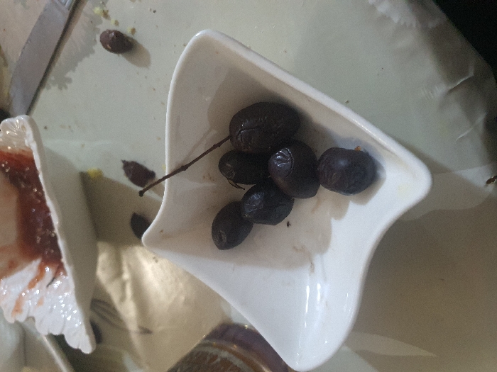 - "A small, white, asymmetrical dish holds several dark purple olives on a thin, brown stem" by FM-zD1853, licensed under CC BY 4.0