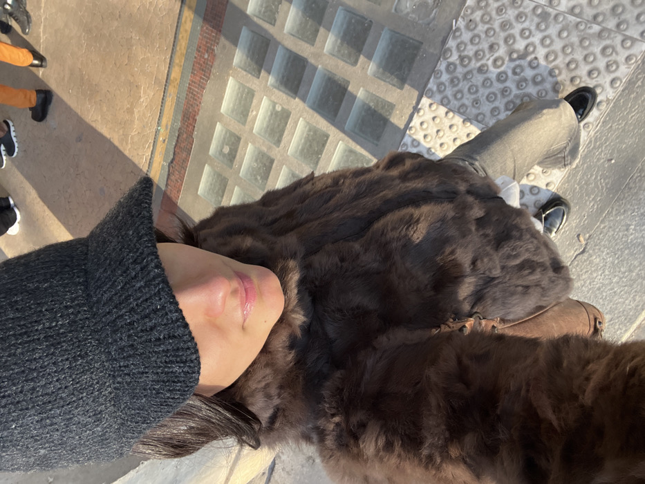 A high-angle, outdoor selfie taken on a sunlit street in Paris, France, captures an individual partially obscured by their attire. The central subject, an adult female, wears a dark grey knitted baseball cap that shades her upper face, revealing her nose, mouth with glossy lips, and chin. She is dressed in a dark brown fur coat or jacket over a light-colored top, paired with light grey trousers and black patent leather loafers. A light brown bag with a braided strap is visible on her left side, hanging beneath the fur coat. The ground around the subject features distinct paving elements: a light grey tactile paving section with raised circular studs in the lower right foreground, adjacent to a grid of square, translucent glass blocks embedded in the pavement, likely illuminating an underground area. Beyond this, a strip of red-brown paving with a yellow line separates these elements from a lighter-colored concrete or asphalt surface in the upper background. This background area shows the lower legs and feet of multiple other pedestrians, indicating a public, populated space. Visible footwear includes white and black sneakers, and black shoes, with one person wearing bright orange pants. The scene is brightly lit by natural sunlight, casting sharp shadows on the pavement. The specific urban paving, particularly the glass blocks, is characteristic of pedestrian areas or squares with underground infrastructure in Paris.