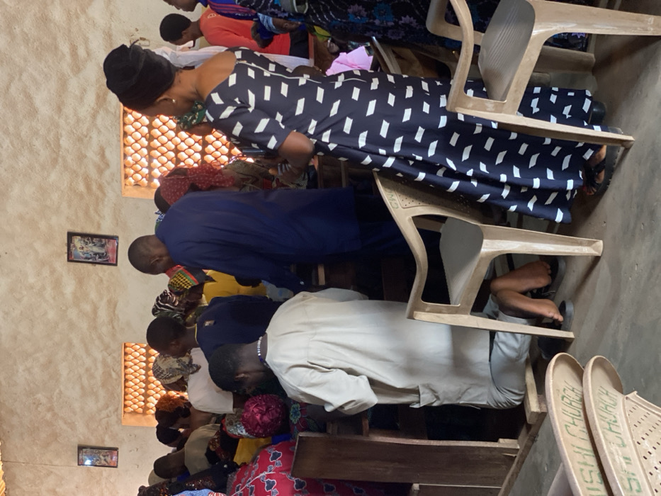The image depicts an indoor gathering within a "SHI CHURCH" in Nev, Nigeria