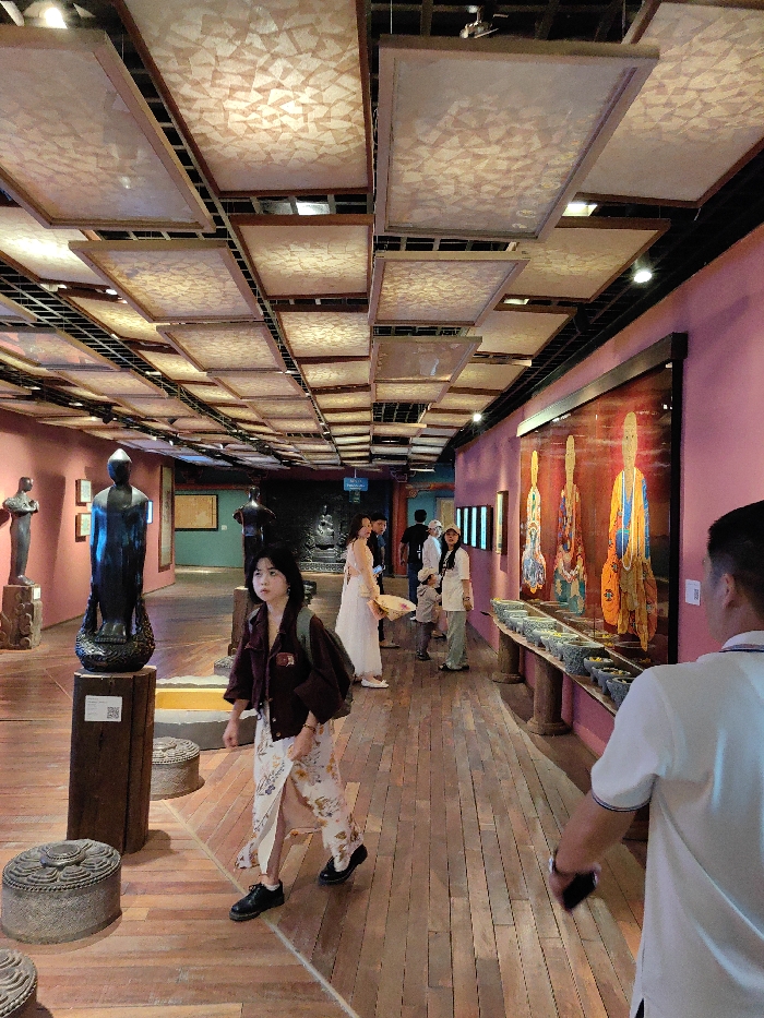 The image depicts an interior view of a museum or exhibition hall located in Hoa Lư Ward, Vietnam. The scene is a well-lit, long hallway with a polished light brown wooden floor composed of planks. The ceiling features a grid of dark beams supporting numerous suspended rectangular panels made of a translucent material with an irregular geometric pattern, illuminated from above. Along the left wall, several dark-colored, stylized human sculptures are displayed on various wooden pedestals. In the foreground left, a tall, dark, standing figure, possibly a Buddha, rests on a prominent wooden block pedestal, adjacent to two circular, patterned stone carvings on the floor. Further down the left wall, other framed artworks or displays are visible. The right wall is painted a reddish-purple hue and features a large, horizontally oriented artwork depicting three seated, robed figures in vibrant colors, predominantly orange, blue, and yellow. Below this artwork, a long, dark wooden display stand holds a series of small, ornate bowls, many containing bright yellow objects. Further along the right wall, multiple smaller, vertically oriented illuminated displays are present. Several individuals are present in the hall. In the foreground, a young East Asian female with dark, shoulder-length hair walks from the background towards the left foreground. She wears a dark reddish-brown jacket, a light-colored long skirt with a floral pattern, and black shoes, carrying a dark backpack on her left shoulder. Partially visible in the foreground right is the back of a male’s head and right shoulder, wearing a white polo shirt with blue and red trim. In the mid-ground, a woman in a long white dress holding a light-colored fan walks away from the camera, and other indistinct figures are observed further down the hall, indicating general pedestrian traffic within the exhibition space.