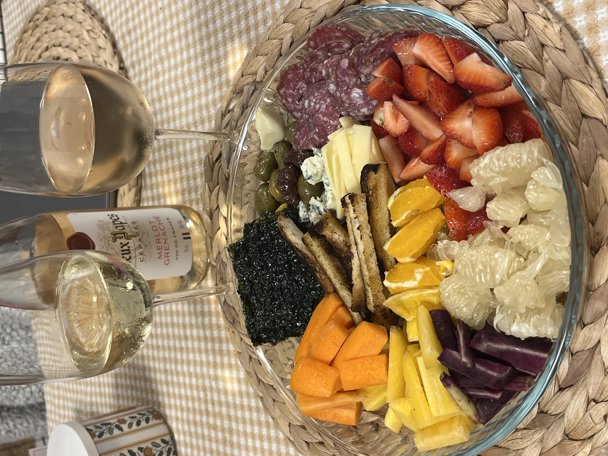 The image displays a clear glass serving platter filled with an assortment of food items, positioned centrally on a light brown woven placemat. The placemat rests on a light yellow and white checkered tablecloth. Behind the platter, two wine glasses, each containing a pale yellow liquid, are present. Between these glasses, a wine bottle labeled "Deux Papes CEPAGES MERLOT GRENACHE VIN DE FRANCE" is visible. A small, cylindrical container with a floral pattern is partially visible on the left side, behind one of the wine glasses. The serving platter contains the following items, arranged in distinct sections: dark green roasted seaweed, an assortment of green and black olives, small wedges of white cheese, crumbles of blue cheese, slices of cured sausage, cut strawberries, peeled segments of pomelo, strips of purple carrots, strips of yellow carrots, strips of orange carrots, toasted bread strips, and orange segments. The scene is consistent with an indoor dining setting in the city of Ramat Gan, Israel.