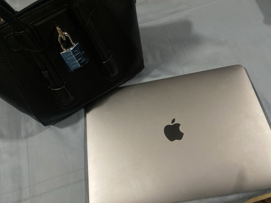 A closed silver-grey Apple MacBook laptop with a visible Apple logo is positioned diagonally in the lower-left to central portion of the frame, resting on a light blue fabric surface. To its upper right, partially overlapping the laptop, lies a black handbag with visible metallic hardware. A blue-toned padlock, displaying a geometric pattern, is attached to the hardware of the handbag. The entire scene is situated in Kubwa, Nigeria.
