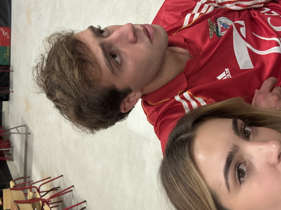 This indoor image captures two individuals in what appears to be a communal space within Décines-Charpieu, France, likely a community hall or cultural association. In the foreground, partially visible on the lower left, is the upper portion of a female's face, featuring brown eyes, prominent eyebrows, and light brown hair with a central part. Her gaze is directed towards the viewer, suggesting she is holding the camera or is closest to it. Behind her and to the right is a young adult male with messy light brown hair, his head turned upwards and to the right of the frame, not looking directly at the camera. He is wearing a red short-sleeved polo shirt with white stripes on the shoulders, a white Adidas logo on the right chest, and the S.L. Benfica crest on the left chest, with a white number '7' visible below it. His right hand rests near the bottom center of the frame, adjacent to the female's position. The background features a light-colored, possibly concrete or tiled, floor. In the upper left quadrant, several chairs with red metal frames and light-colored seats are visible, some partially stacked. In the upper right, a red banner or decoration with white and possibly green details, including what appears to be a white musical note symbol and partial text, is displayed against a dark background.