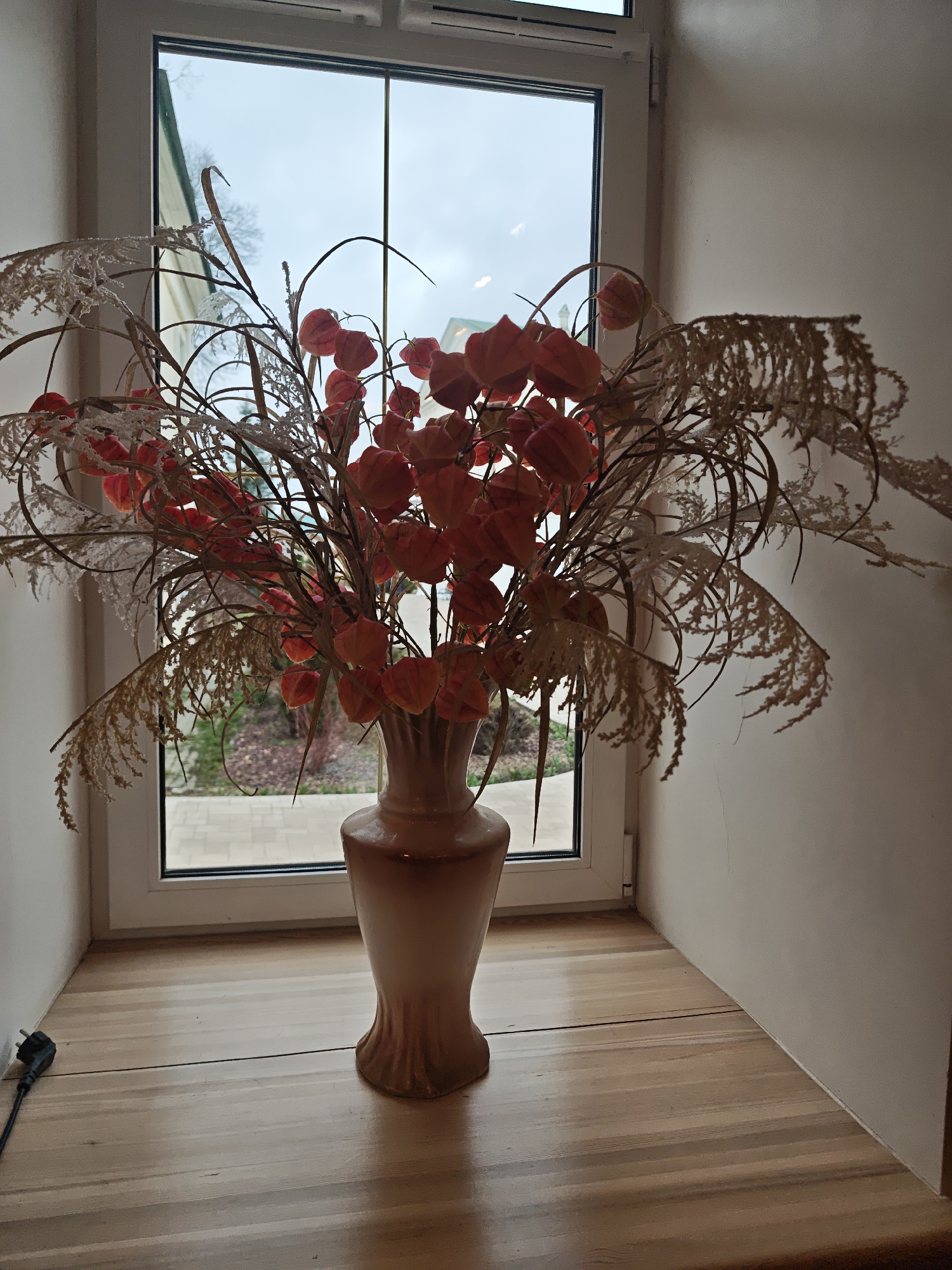 A vase of orange and brown dried flowers sits on a wooden shelf in front of a window. The window looks out onto a garden with a walkway. An electrical cord and plug are visible on the left side of the shelf. The walls surrounding the shelf are off-white. The scene is likely indoors. The location is Луговой, Russia.