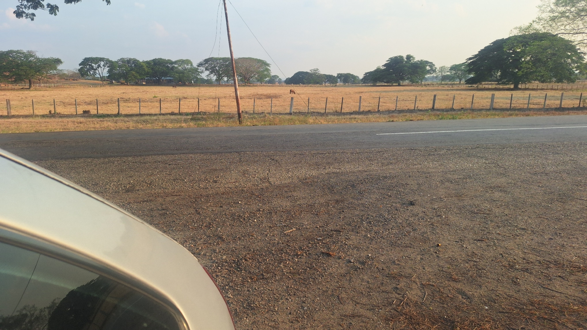 The image displays a rural or semi-rural landscape in the city of Unknown, Venezuela, captured under a clear, possibly hazy sky. In the lower-left foreground, a portion of a light-colored vehicle, consistent with a silver car's rear roof and window, is visible. Extending from the bottom-right, a gravel and dirt shoulder parallels an asphalt road. The road, which appears worn, features a solid white line marking its edge. Beyond the road, a wide, dry, light brown field or pasture is present, bordered by a fence line composed of regularly spaced light-colored wooden or concrete posts. Within this field, a dark-colored equine animal, likely a horse, is observed grazing near a fence post in the mid-left. A wooden utility pole with attached wires stands near the road on the left side, extending vertically towards the sky. In the background, numerous large, mature trees with dense green foliage are distributed across and beyond the field, forming a distinct tree line against the pale blue sky.