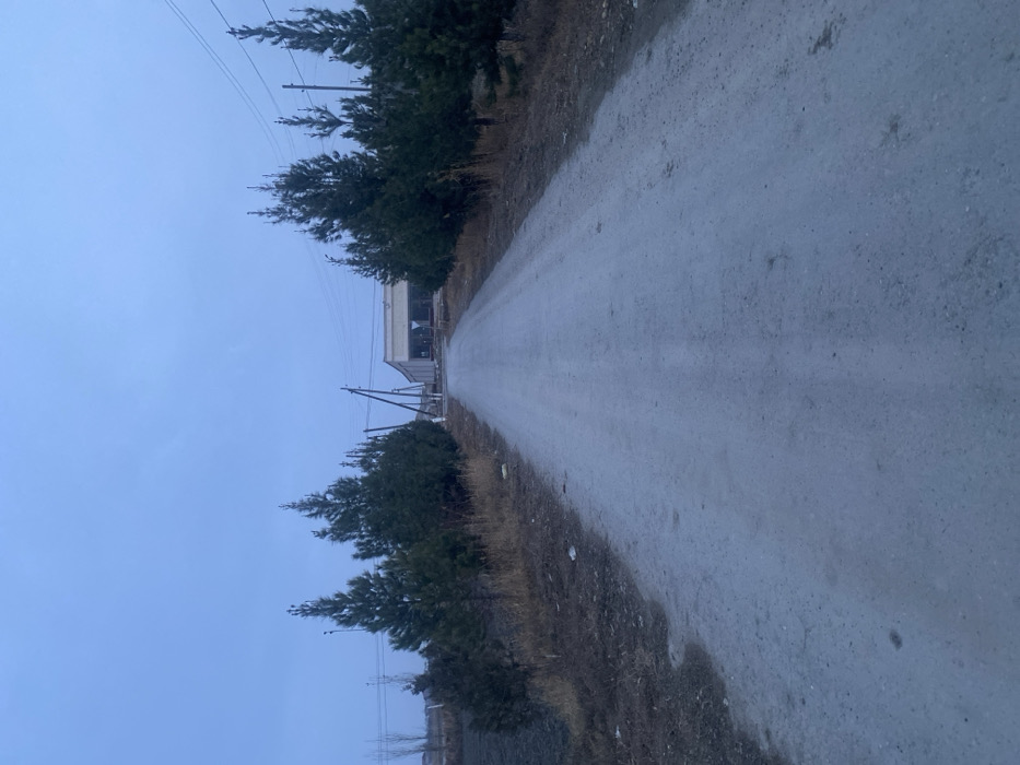 A rural road stretches into the distance, flanked by evergreen trees on both sides. A building is visible further down the road. Utility poles run along the left side of the road. The sky is overcast, contributing to a somber, muted color palette. The road surface appears to be gravel or dirt.
