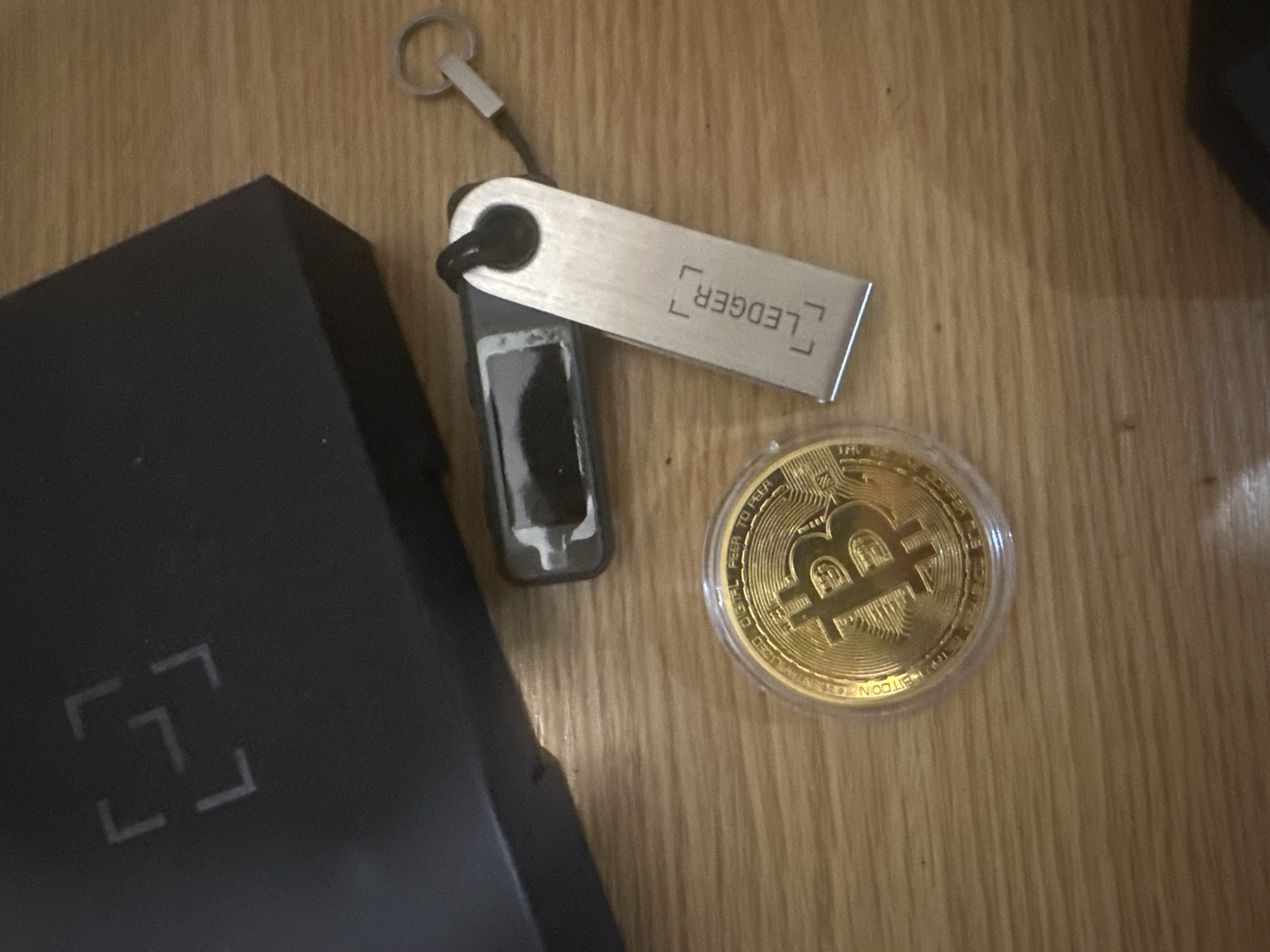 The scene depicts a flat lay of cryptocurrency-related items on a light-brown wooden surface in Unknown, Unknown. Dominant features include a gold-colored commemorative Bitcoin coin encased in a clear plastic holder, positioned in the lower-left quadrant. Above and to its right, a silver-colored Ledger hardware wallet, displaying the "LEDGER" brand name and logo, is connected via a black loop to a smaller, dark rectangular device with a damaged or peeling screen. A small metallic keyring is attached to the opposite end of the Ledger device's loop. In the upper-left quadrant, a portion of a black rectangular box is visible, featuring a white/light grey stylized logo on its top surface, consistent with the Ledger branding. The wooden surface exhibits horizontal grain patterns. No individuals are present, and no actions or interactions are occurring.