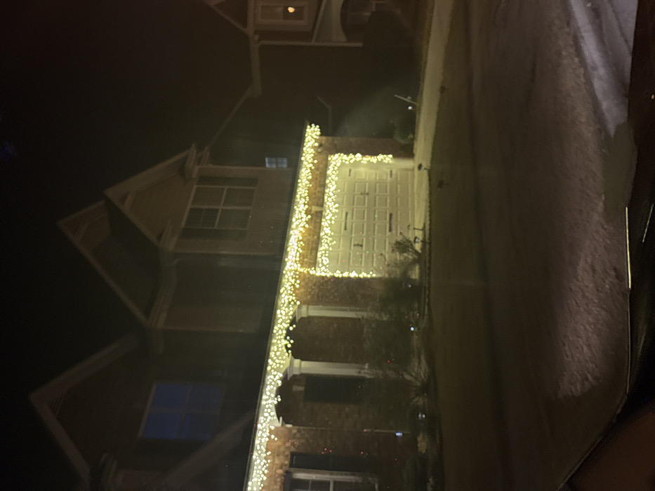 A house is adorned with festive string lights outlining the roofline and garage. The two-story house has windows visible, one appearing with a blue hue. A driveway stretches beside the house, and the image suggests it was taken from within a vehicle due to the presence of interior reflections. The scene is at night, with the lights providing the primary illumination.