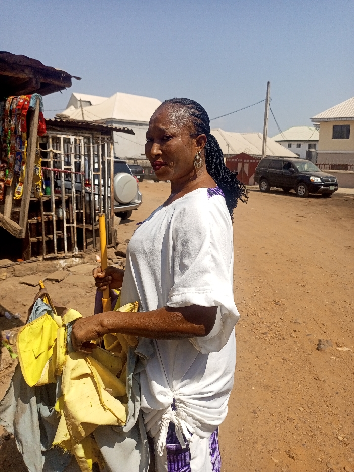 This image depicts an outdoor street scene in Lokoja, Nigeria, under a clear blue sky
