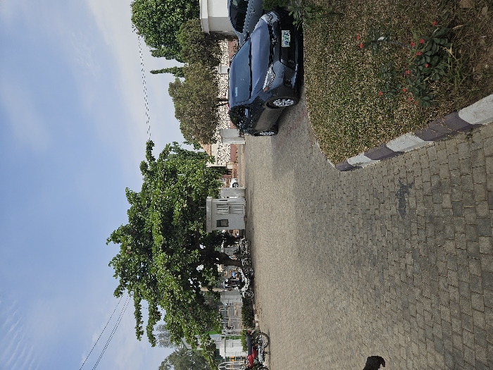This image depicts an outdoor paved area in Unguwar Shanu, Nigeria, under a clear blue sky with minimal cloud cover. The ground is covered with grey interlocking pavers. In the mid-ground, a large tree with abundant green foliage stands prominently. Beneath this tree and slightly to its left, a small, white security booth or guardhouse is visible. Further left and behind the booth, several motorcycles are parked. On the right side of the frame, a dark grey sedan, possibly a Toyota Corolla, is parked, facing left. Its Nigerian license plate is partially visible. Adjacent to the sedan, a raised curb painted white and dark brown borders a small cultivated area with green grass and sparse red flowering plants. Overhead utility lines traverse the upper portion of the sky. The lower-left corner of the image shows a partial view of a dark-skinned hand and forearm. In the background, additional trees and sections of white walls or structures are present.
