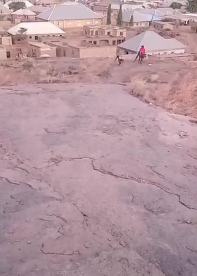 The video depicts three individuals walking on a rocky terrain, with a residential area visible in the background. The foreground is dominated by a large, flat rock surface, which shows signs of cracking or erosion. Patches of dry grass and shrubs surround the rock. Three people are making their way across the open space. One is wearing a bright red or pink top, standing out against the muted colors of the landscape. The residential area in the background consists of buildings with a mix of flat and gabled roofs, mainly in neutral tones. There are a few trees that add some greenery. The overall environment appears dry and arid, with a slightly hazy or dusty quality.