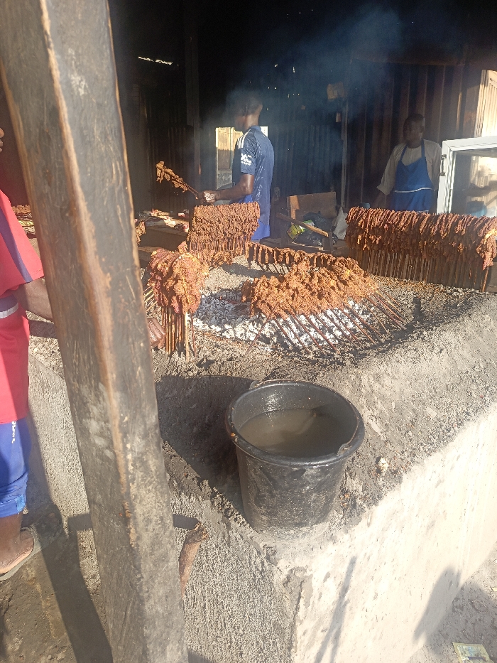 This image depicts an outdoor or semi-open grilling operation in Unguwar Shanu, Nigeria