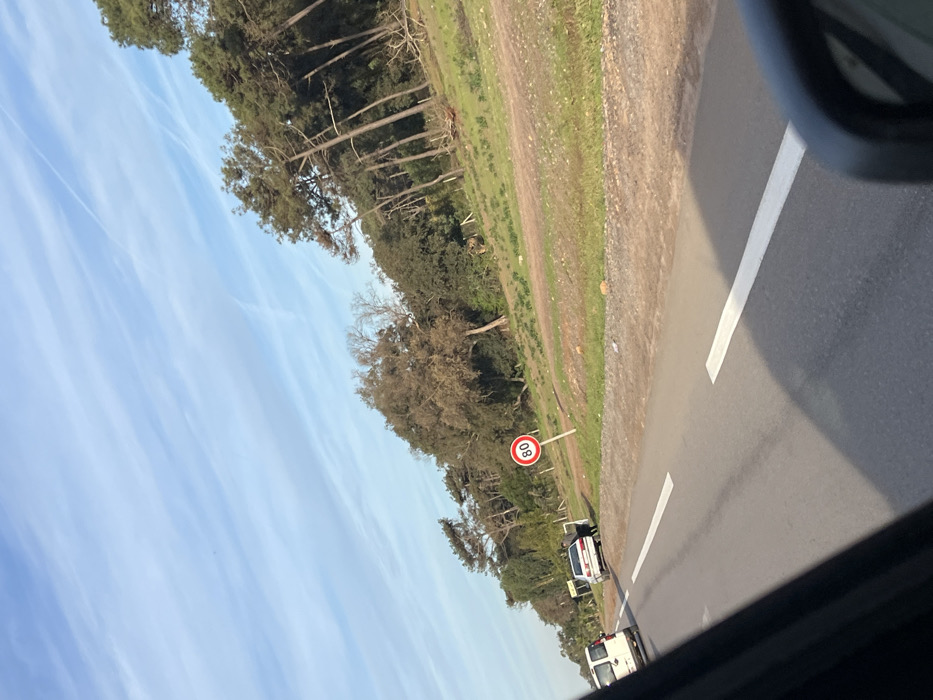 From inside a vehicle, the view is of a highway bordered by trees and grassland. A white line divides the lanes. Several vehicles travel on the road, with an 80-speed limit sign visible. The sky is clear blue with streaks of clouds. The angle is canted, giving the impression of movement. Part of the vehicle's interior is visible in the lower right corner.