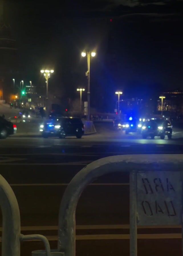 At night, a motorcade with flashing red and blue lights travels along a city street
