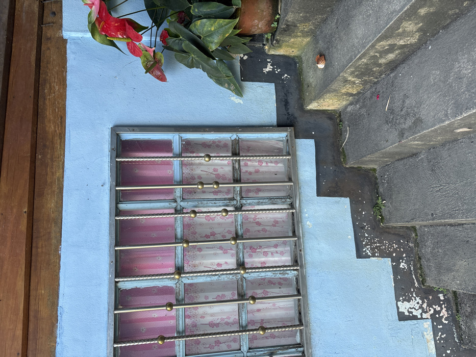 The scene depicts a static exterior view of a building in Pa Pae, Thailand. A light blue stucco wall, exhibiting some weathering, occupies the central and left portions of the image. Above this wall, a horizontal section of dark brown wooden planks is visible. A rectangular window is set into the blue wall on the left. This window features a light blue frame, subdivided into multiple panes, with paint visibly chipped. A metal security grille, composed of vertical bars with braided elements and spherical brass-colored embellishments, is affixed over the window. Pink curtains with a light-colored floral pattern are drawn behind the window panes. To the right, a set of dark gray concrete stairs ascends from the foreground towards the upper right. The base of the blue wall where it meets the stairs is painted dark gray or black, with significant flaking and wear revealing lighter substrate beneath. On an upper step to the right, a brown terracotta pot contains a large Anthurium plant, characterized by dark green leaves and multiple bright red, heart-shaped spathes with prominent yellow spadices. Small pieces of organic debris are present on the concrete steps. No individuals are depicted.
