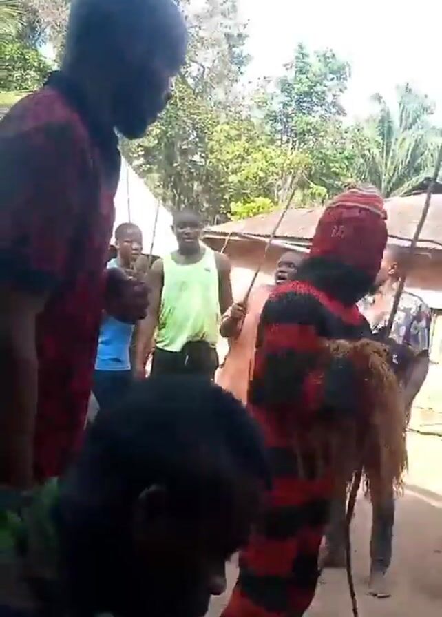 The video depicts a cultural event taking place outdoors. Several individuals surround a person adorned in a full-body knitted costume with horizontal red, black, and green stripes. The costume also features a hood and bundles of brown fibrous material attached to the front and ankles. Some of the surrounding individuals hold thin, long sticks. The setting appears to be a rural area with simple buildings, trees, and a dirt ground.