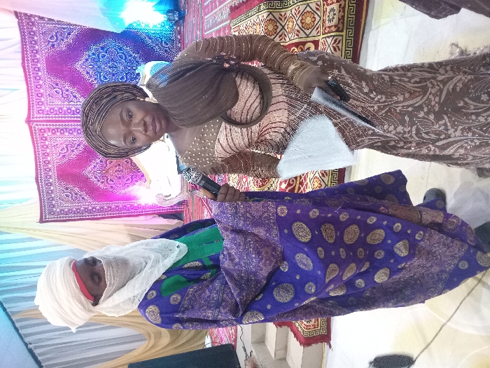 two people standing in what appears to be a hall decorated for a special occasion. The man on the left is wearing a white skullcap and a white, patterned robe over a blue, patterned robe. He has a dark complexion and is wearing a white face mask. The woman on the right is wearing a brown, patterned dress with a matching headscarf. She is holding a white object in her right hand and a black object in her left hand. Both people are looking at the camera. There are decorative carpets on the floor, and behind the two people is a decorative wall adorned with a tapestry in shades of pink and purple. The image was taken in Birnawa, Nigeria.