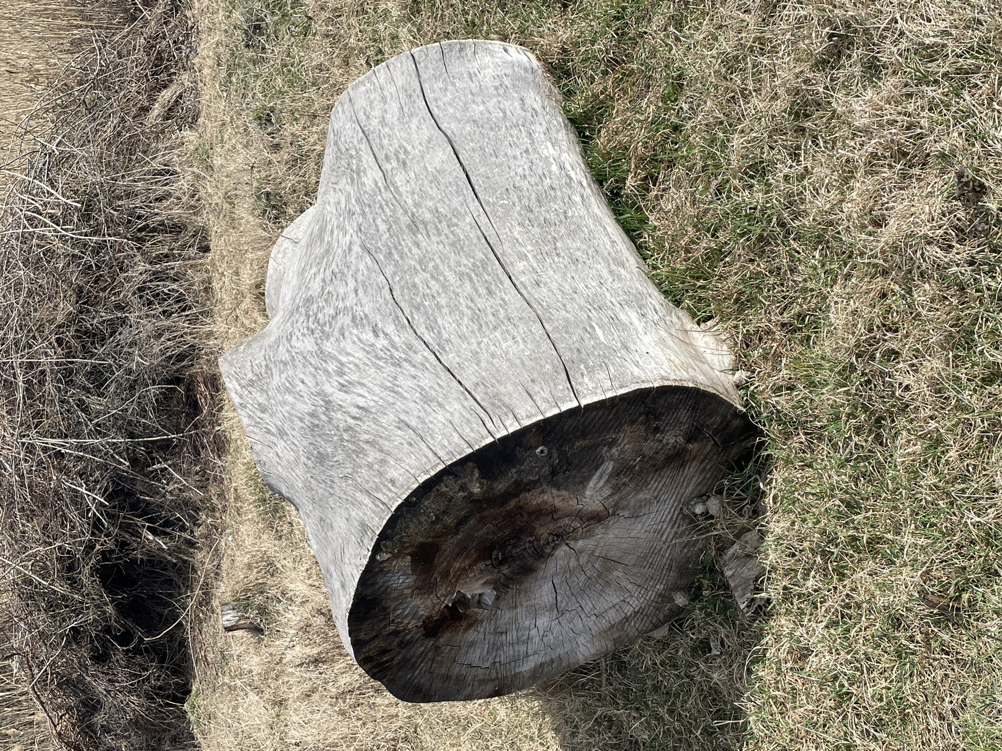 The image displays a large, weathered tree trunk lying horizontally on the ground in Vinnytski Khutory, Ukraine. The trunk is predominantly light gray to silver, with visible longitudinal cracks along its surface, indicating an absence of bark and exposure to elements. Its cut ends are dark brown, exposing concentric growth rings and radial cracks, with evidence of deterioration or moisture saturation in the darker areas. The trunk rests on a ground cover composed of a mixture of dry, light brown grass and patches of green grass. In the background, beyond the trunk, there is a dense thicket of intertwined, leafless, dark brown branches and twigs. A smaller, weathered tree stump is visible vertically embedded in the dry grass in the mid-background to the left of the main trunk. The scene is illuminated by natural sunlight from the upper right, casting shadows to the left and beneath the large trunk. No individuals, animals, or active interactions are present in the frame.