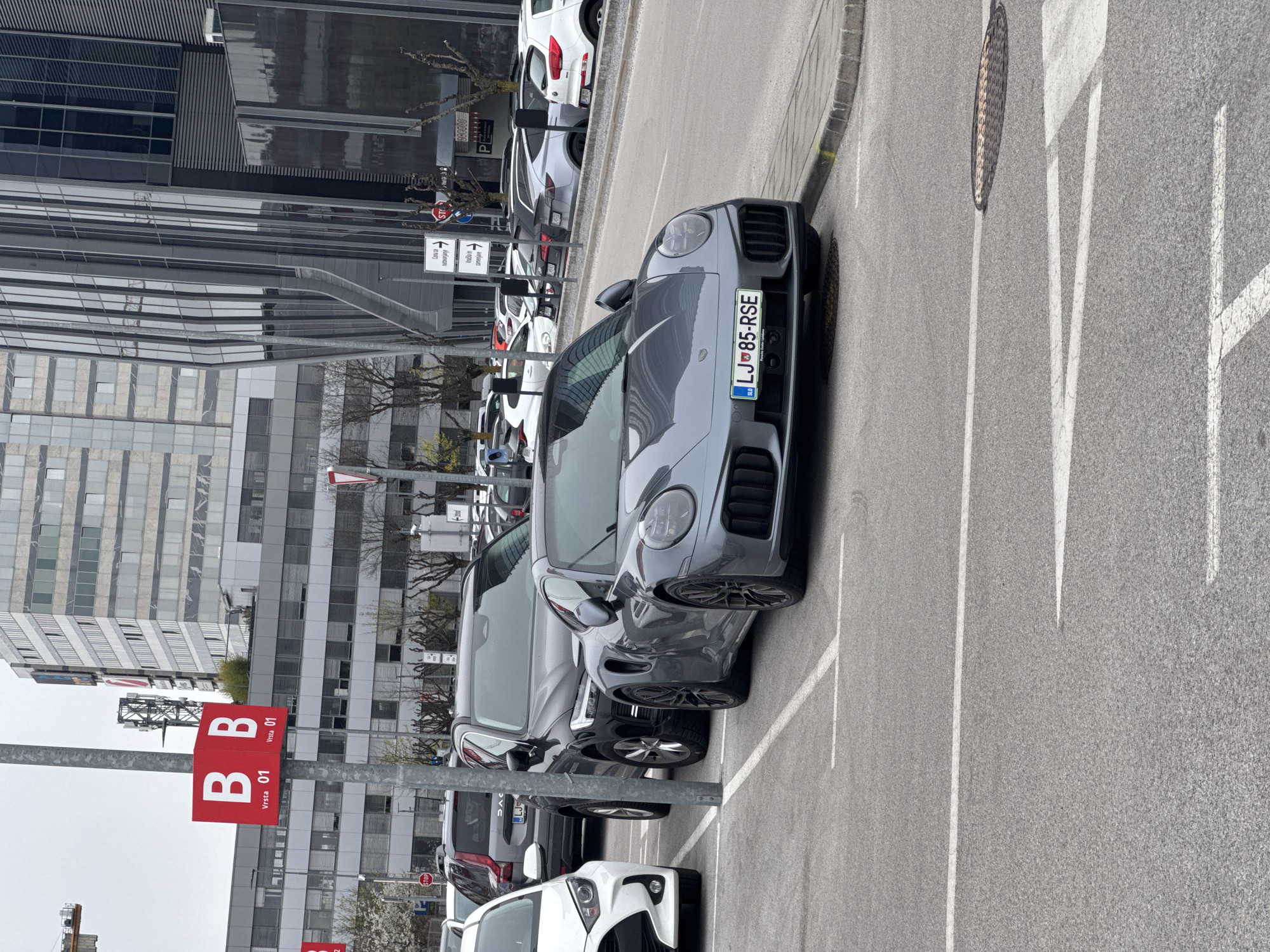 The image captures a street scene in Ljubljana, Slovenia, identifiable by the license plate "LJ-85-RSE" on a gray Porsche parked along the street. The vehicle is facing right and is surrounded by other parked cars. The street has designated parking spots marked with white lines. A red sign with white lettering "B B Vrsta 01" is visible on a pole near the vehicles. The background consists of modern buildings, including one with a glass facade and another with a grid-like design. The day appears overcast, and there are no people immediately visible in the foreground.