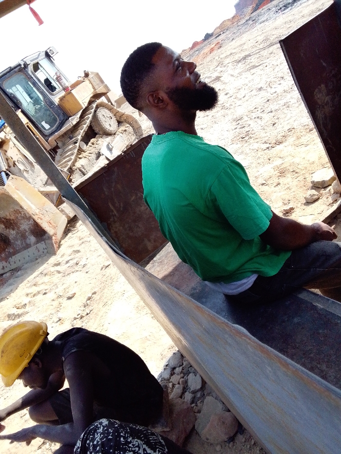 Two men are at a construction site. One wears a green shirt and sits on a metal object, looking upwards. The other, wearing a yellow hard hat, is crouching and working. Heavy machinery like a bulldozer is visible in the background on the sandy ground. The scene is lit with bright sunlight, and the perspective is a low-angle shot.