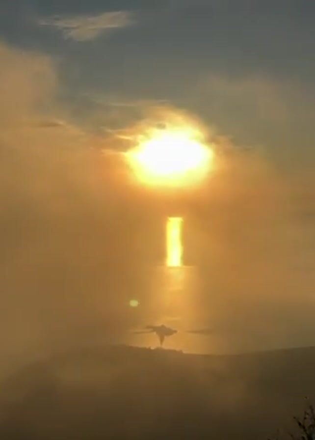 bright sun shining through a layer of fog or clouds, with the sun's reflection creating a shimmering, golden path across the water below