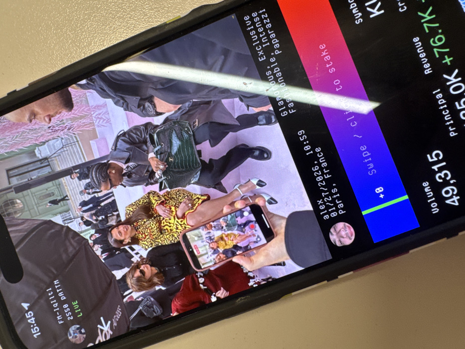 A cell phone displays a video or image featuring celebrities or fashion models. The upper portion shows financial data, including a volume of 49,315, a principal of 35.0K, and a revenue of +76.7K. On the left, details such as a time (15:45), an event ID (FM-IqIlt1 2550 PATTN), and a "LIVE" label are visible. Additional text mentions "Glamorous, Exclusive," "Fashionable, Intense," and "Paparazzi," along with a date and location: "01/27/2026, 10:59 Paris, France."